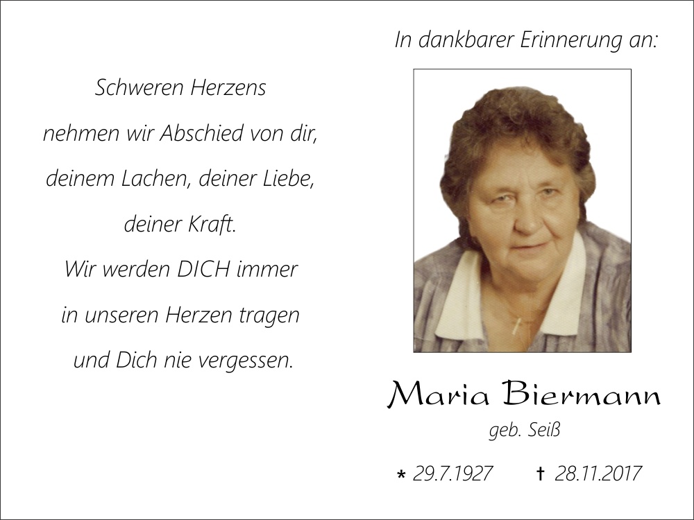 Biermann Maria geb. Seiß † 28.11.2017 « zurück