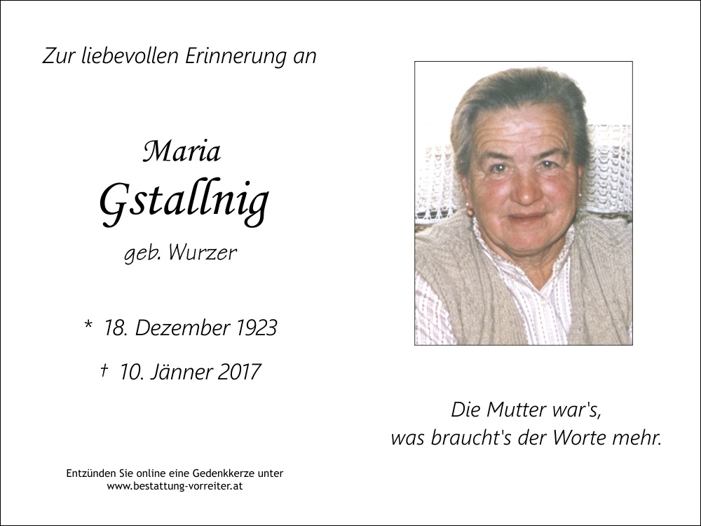 Gstallnig Maria, geb. Wurzer † 10.01.2017 « zurück