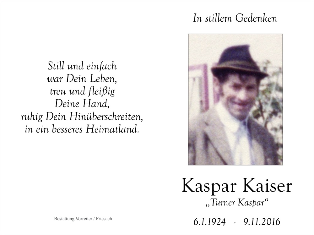 Kaiser Kaspar ,,Turner Kaspar" † 09.11.2016 « zurück