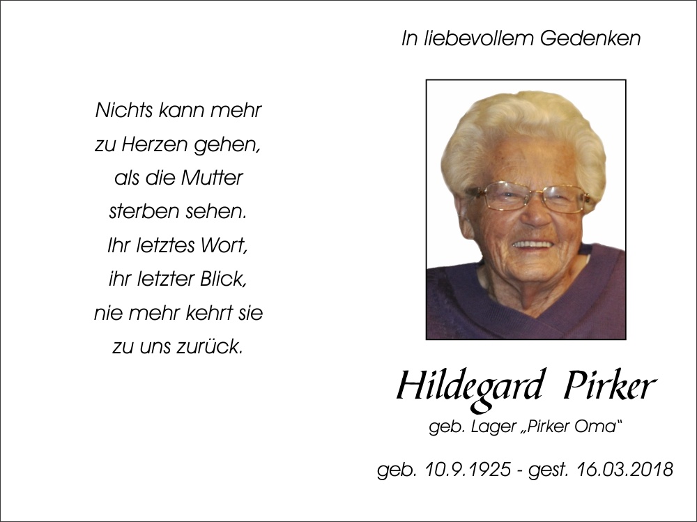 Pirker Hildegard, geb. Lager † 16.03.2018 « zurück