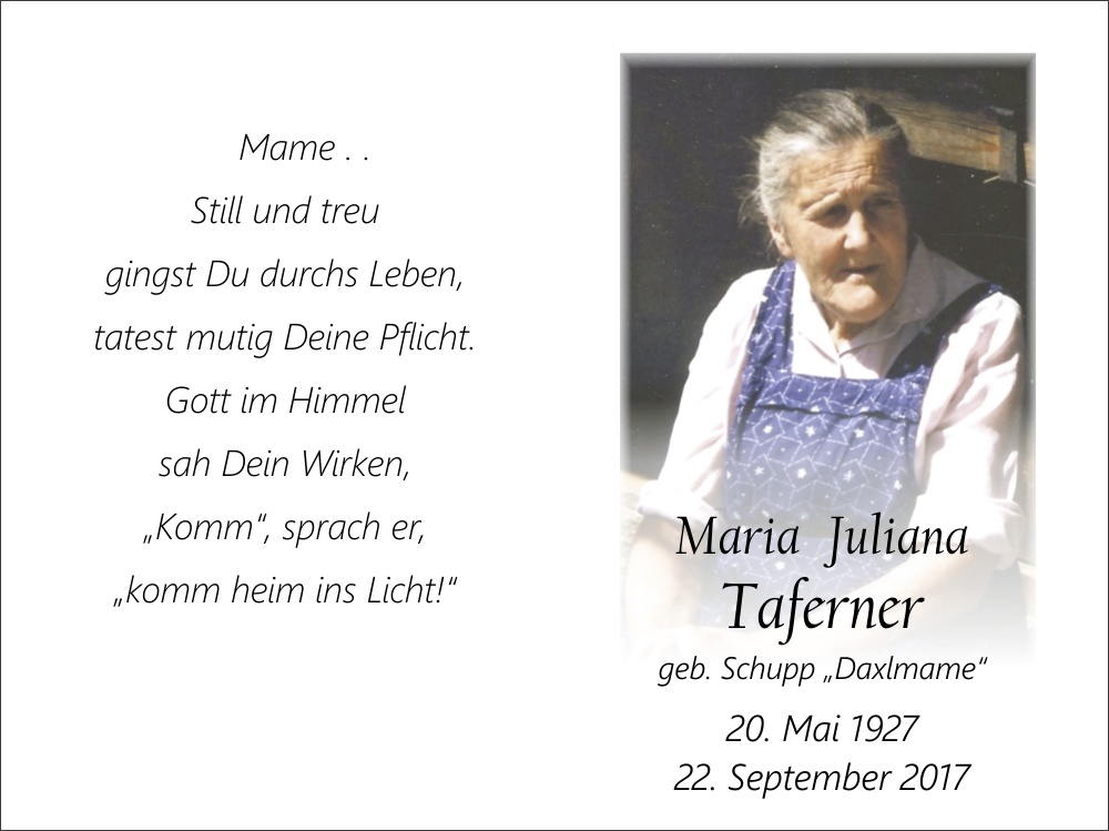 Taferner Maria Juliana, geb. Schupp "Daxlmame" † 22.09.2017 « zurück