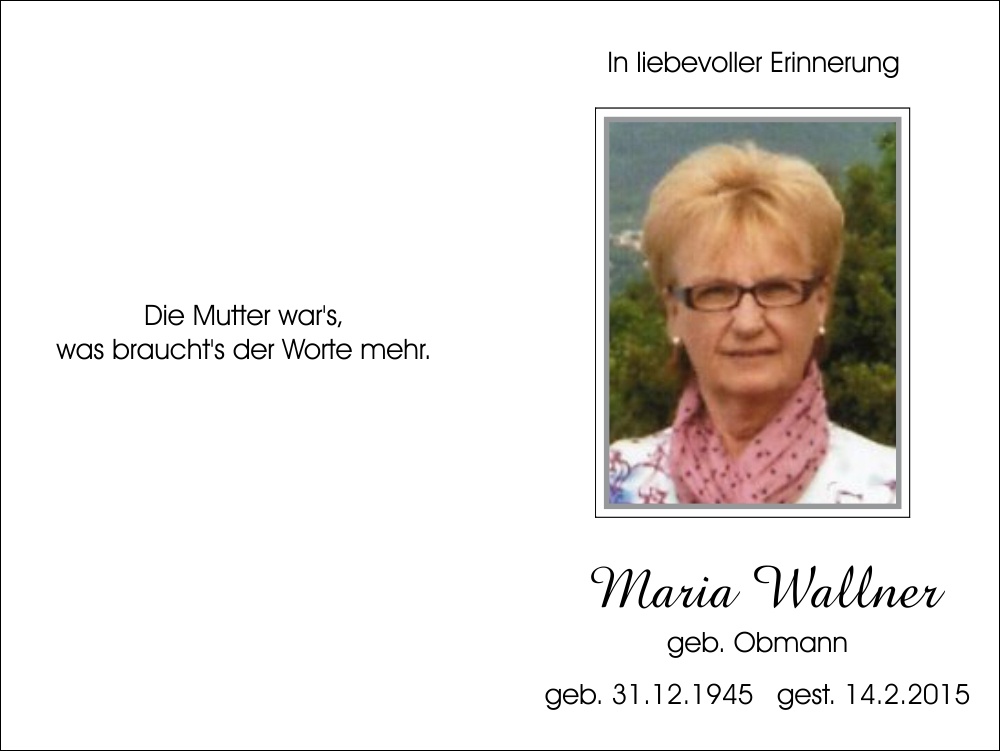Wallner Maria geb. Obmann † 14.02.2015 « zurück
